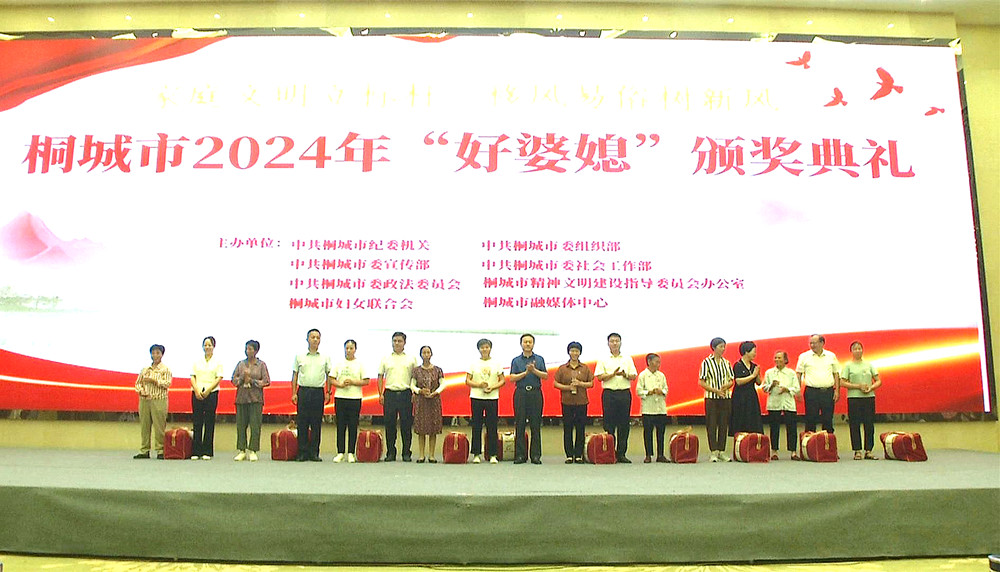 9月19日,桐城市2024年“好婆媳”頒獎典禮隆重舉行。市委副書記洪長久出席活動并致辭,市領(lǐng)導方錢方、祖聰、董紅軍、陳玉蓮、杜進、劉決成出席活動,共同為受表彰的20位“好婆婆”“好媳婦”頒獎。