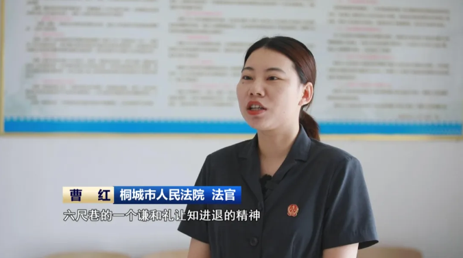 ![]() 桐城市人民法院 法官 曹紅 我們主要運用六尺巷的一個謙和禮讓知進退的精神,引導(dǎo)雙方當事人換位思考,再從法理和事理的前提下,我們再通過勸說各方各退一步。 ![]()