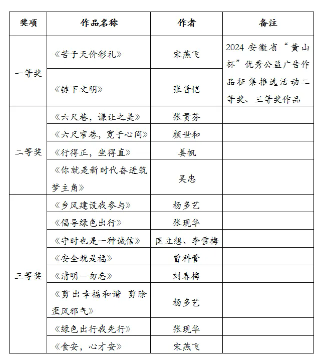 2024年桐城市優(yōu)秀公益廣告作品征集活動獲獎作品公示期已經(jīng)結束,獲獎作品通過初評、終評、公示等層層把關,按照活動評選規(guī)則,現(xiàn)將26件獲獎作品正式對外公布。即日起陸續(xù)展播。