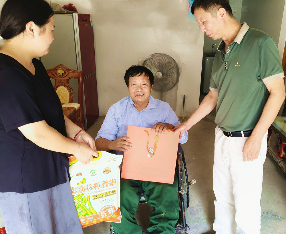9月28日,桐城興財(cái)控股集團(tuán)公司工作人員上門走訪慰問(wèn)新渡鎮(zhèn)合城村脫貧戶汪旭峰(中),為其送上大米、月餅等慰問(wèn)品,并致以誠(chéng)摯的節(jié)日問(wèn)候。 中秋佳節(jié)將至,為讓困難群體度過(guò)一個(gè)祥和溫馨的節(jié)日,該公司組織人員走進(jìn)結(jié)對(duì)幫扶村——合城村、鳳凰村,走訪慰問(wèn)兩村共10戶困難家庭,為他們帶去滿滿的節(jié)日祝福。 洪貞貞 雷蕾 孫傳銀 攝 |
