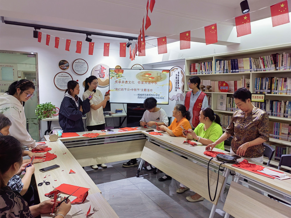 丹桂飄香,“非遺”溢彩。9月30日,中秋佳節(jié)將至之際,文昌街道西苑社區(qū)聯(lián)合桐城師專,以“傳承非遺文化·鄰里共話中秋”為主題,在社區(qū)新時代文明實踐站開展“我們的節(jié)日•中秋節(jié)”活動。 活動伊始,社區(qū)志愿者通過生動有趣的講解,探尋中秋節(jié)的起源、流傳至今的節(jié)日習(xí)俗。在經(jīng)典古詩詞品讀環(huán)節(jié),大家齊誦“明月幾時有,把酒問青天……”,與宋代詩詞大家蘇軾一起感悟?qū)υ滤既说睦寺壹覉F(tuán)圓的美好憧憬。 活動現(xiàn)場,桐城師專的學(xué)生為居民們帶來了精彩的“桐城歌”表演,婉轉(zhuǎn)悠揚(yáng)曲調(diào)和非遺文化解讀,讓居民們深入了解了“桐城歌”背后的文化密碼。該校胡老師為大家詳細(xì)介紹了剪紙藝術(shù)的悠久歷史和文化底蘊(yùn)。在師生指導(dǎo)下,居民們紛紛拿起剪刀、參與制作,用匠心創(chuàng)作自己的剪紙作品。隨著一幅幅剪紙作品的誕生,居民們的成就感、喜悅感溢于言表。 此次活動不僅是一次難得的文化體驗之旅,更是對非遺文化的一次深情致敬與傳承。 (孫羱 曹姍) |
